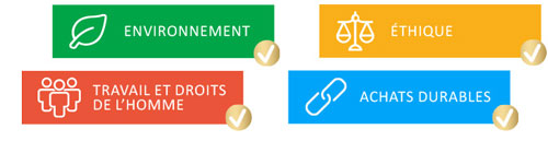 La fiche d’évaluation de la durabilité illustre les performances de 21 indicateurs dans quatre thèmes : Environnement, Travail et droits de l’Homme, Éthique et Achats durables.